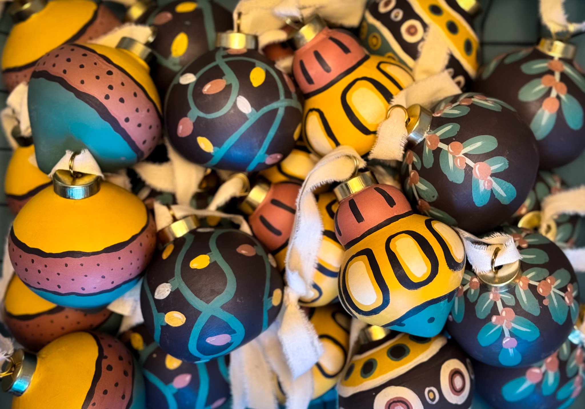 My 2025 hand-painted ornament collection features six unique designs, each illustrated with bold patterns, abstract shapes and playful linework in rich, earthy tones all tied with soft frayed-edge cotton ribbon for a handcrafted finish. This collection is a fresh take on holiday décor that feels cozy, artistic, and original.